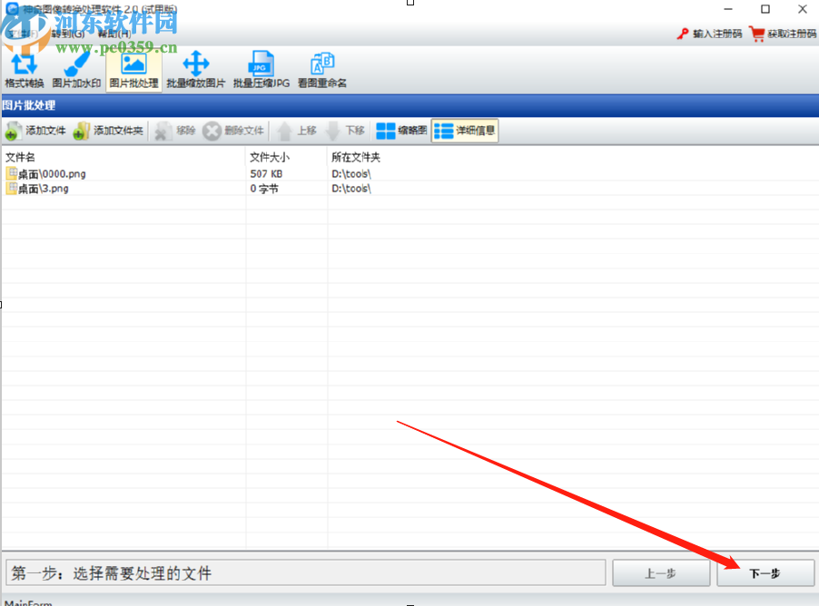 3.点击确定按钮之后软件会自动识别在文件夹中的图片文件,识别出来之后显示图片文件的列表,然后点击右下角的下一步按钮。