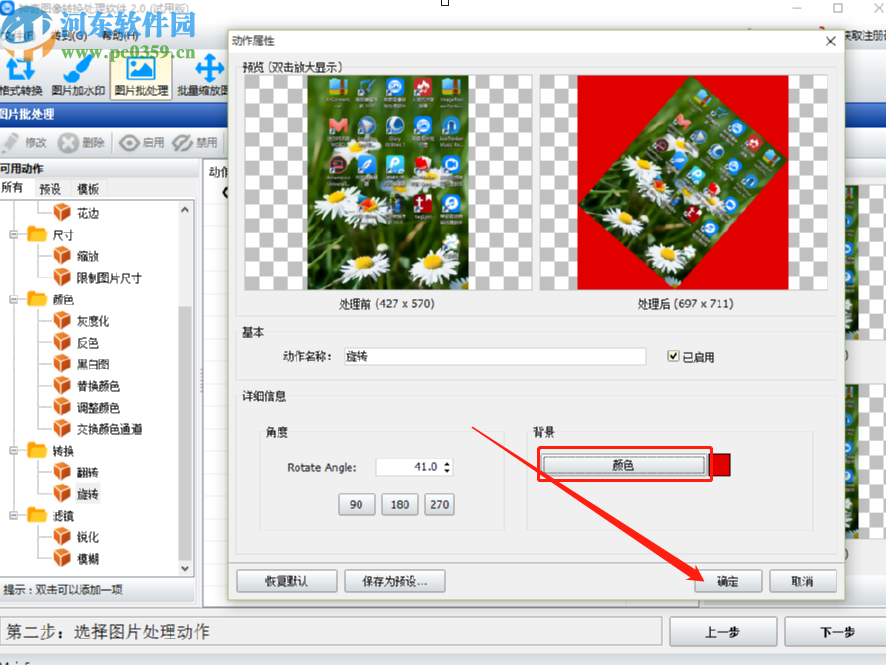 5.设置好旋转角度之后,点击颜色按钮可以设置旋转之后的图片背景,点击确定按钮保存旋转相关设置。