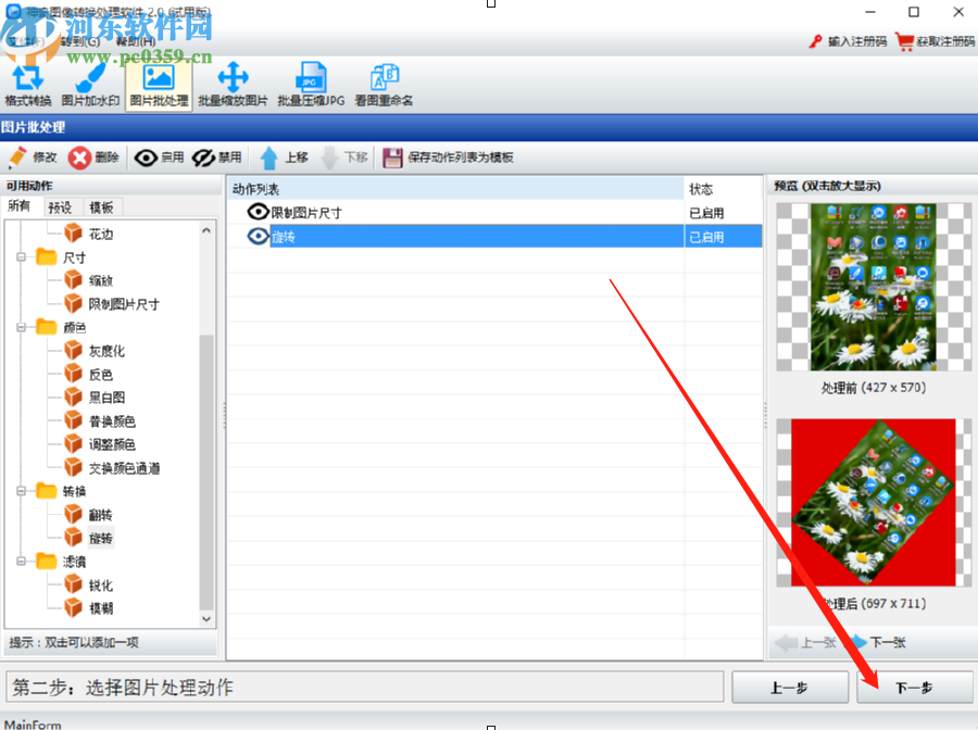 4.点击下一步之后进入到功能的选择界面,在界面左边找到旋转功能之后双击即可打开旋转图片的界面,在下图中框出的位置即可设置旋转图片的角度。