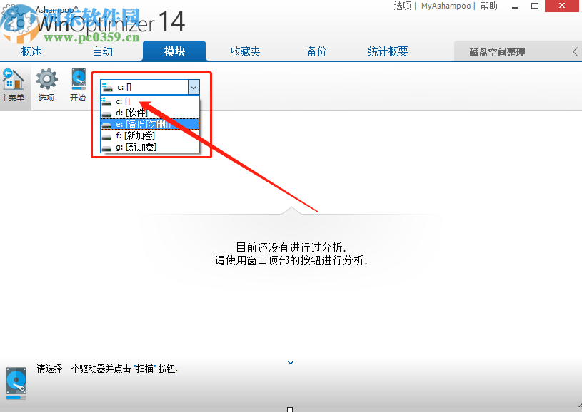 2.点击进入到查找资源占用大户这个功能界面,第一步需要选择想要查看的磁盘,点击下拉列表之后可以进行选择。