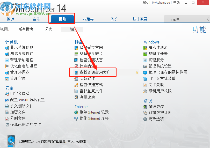 1.首先第一步我们打开软件之后点击切换到模块界面,然后在其中选择点击“查找资源占用大户”这个功能选项。