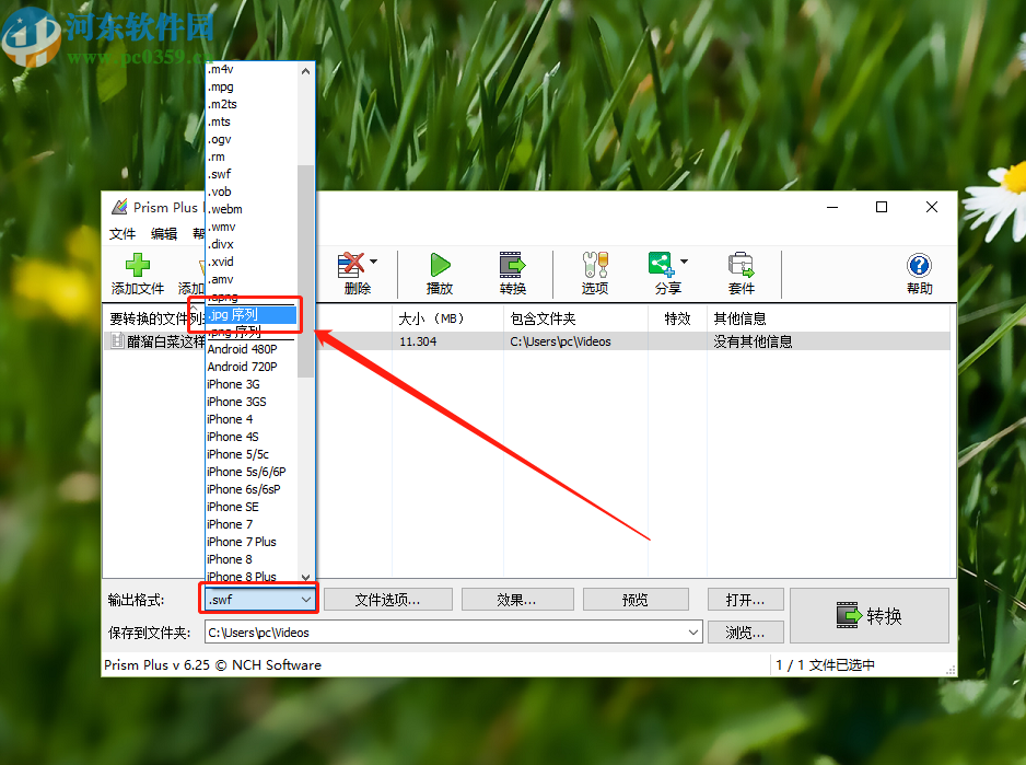 3.点击这个打开按钮之后在软件界面就可以看到添加进来的视频文件了,我们点击输出格式选项的下拉列表,在其中找到.jpg序列这个选项点击选择。