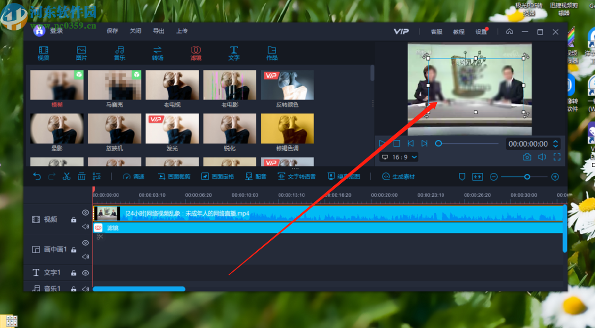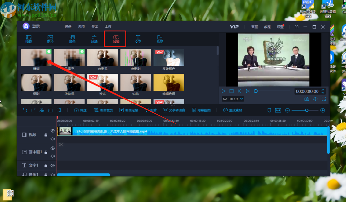 6.找到模糊滤镜之后点击将它拖动到下方视频操作台中,鼠标点击滤镜之后不放,移动到下方操作台视频的下面就可以了。