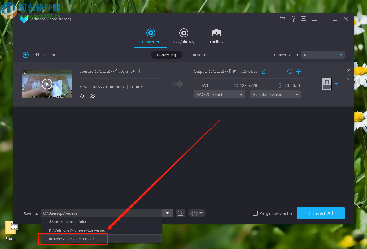 5.选择好想要转换的视频格式之后,在界面左下角点击保存选项的下拉列表,然后在其中可以选择最后一项,浏览和选择文件夹。