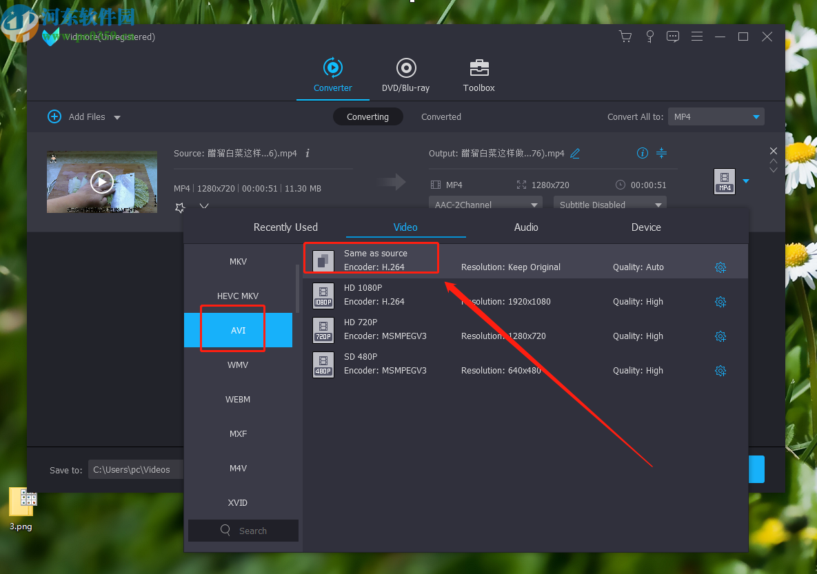 4.点击这个视频格式图标之后,我们在出现的选择视频格式界面中选择自己想要转换的AVI格式,选中之后在右边选择AVI格式视频的清晰度。