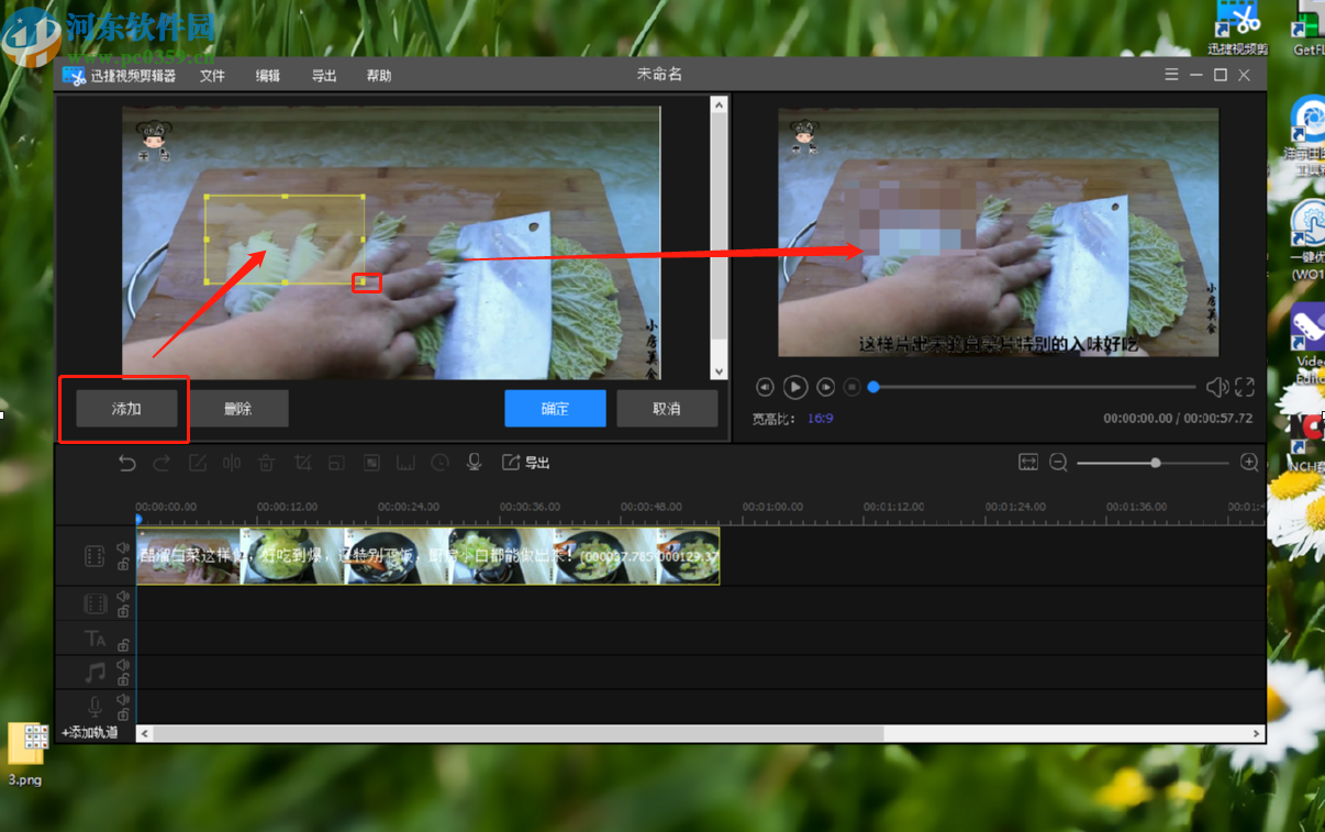 6.点击马赛克之后下一步界面上方出现一个功能界面,我们点击添加按钮之后会出现一个设置马赛克大小区域的黄色选框,我们移动选框选择位置,还可以调整选择区域的尺寸,右边可以看到马赛克效果。