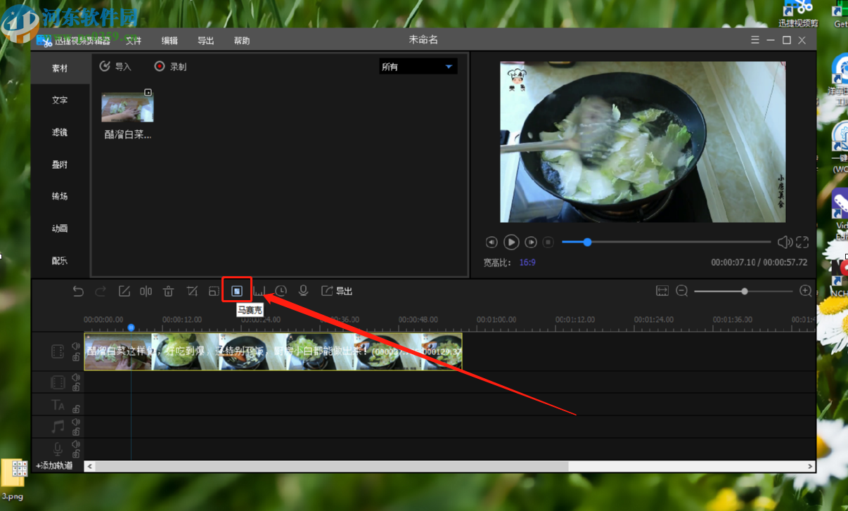 5.将视频拖动到操作轨道上面之后,我们点击上方功能中的马赛克这个功能图标,点击它选择马赛克功能。
