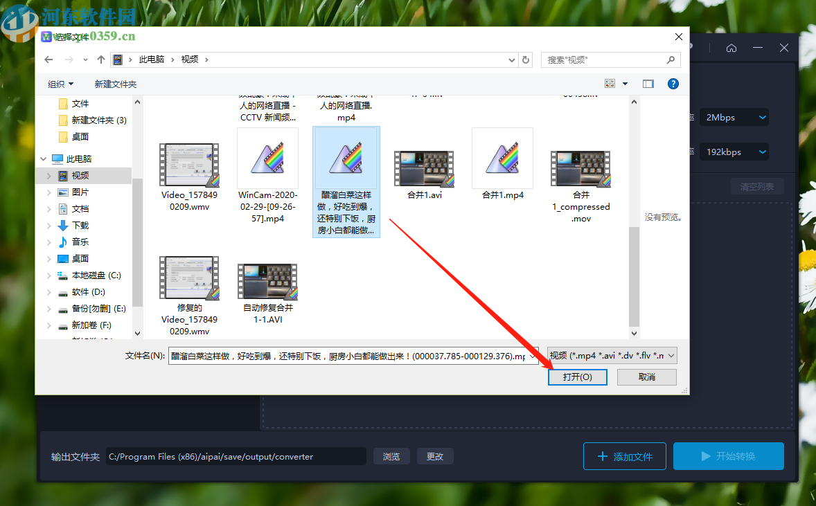 3.点击添加文件按钮之后,接下来在出现的选择文件界面中,选中想要处理的MP4视频文件之后,点击右下角的打开按钮即可。