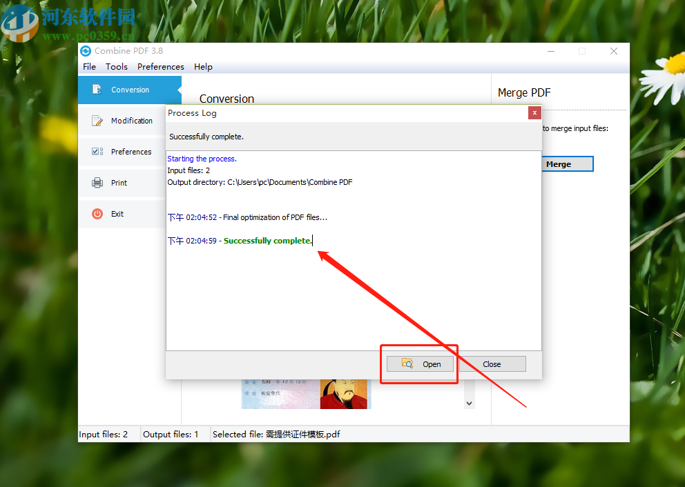 4.点击这个merge合并按钮之后就会开始合并PDF文件的操作,等到最后合并完成会显示一个合并结果,点击open按钮可以查看合并的PDF。