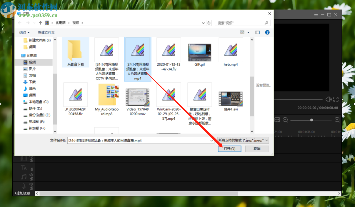 2.点击导入文件之后,下一步就是在出现的选择文件界面中选择想要编辑的视频文件,选中之后点击右下角的打开按钮。