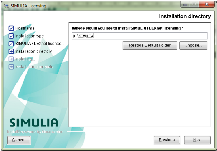 12、选择许可证安装位置,默认C:SIMULIA,这里改成你想要安装的位置,本人安装在D:SIMULIA,点击next