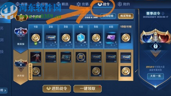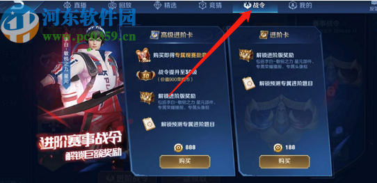 2.点击进入到赛事之后在界面上方可以看到有一个战令模块,点击进入之后会自动弹出战令进阶卡的购买界面,如下图中所示。