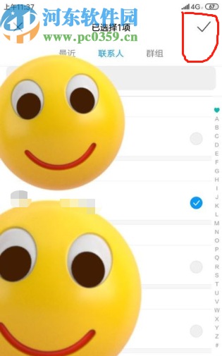 3.点击添加之后获取到手机通讯录权限,进入到通讯录中选择要添加的紧急联系人,我们在通讯录列表中选中之后点击右上角的勾。
