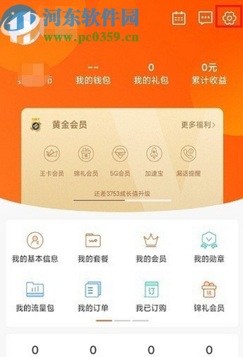 1.首先第一步我们打开手机之后进入到中国联通手机客户端界面,然后在个人中心界面点击右上角的设置图标。