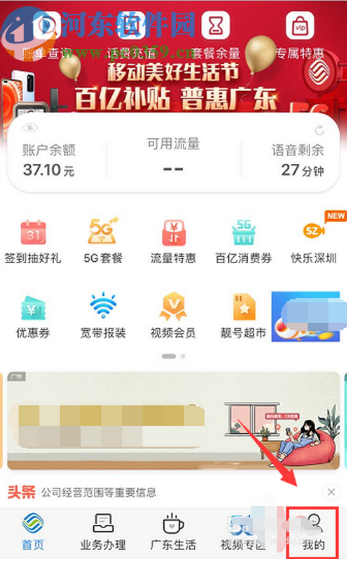 1.首先第一步我们打开手机之后进入到广东移动APP界面,然后在界面右下角点击“我的”切换到个人中心界面。