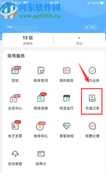 2.切换到个人中心界面之后,我们在常用服务模块中找到充值记录这个功能选项,然后点击进入到其中。