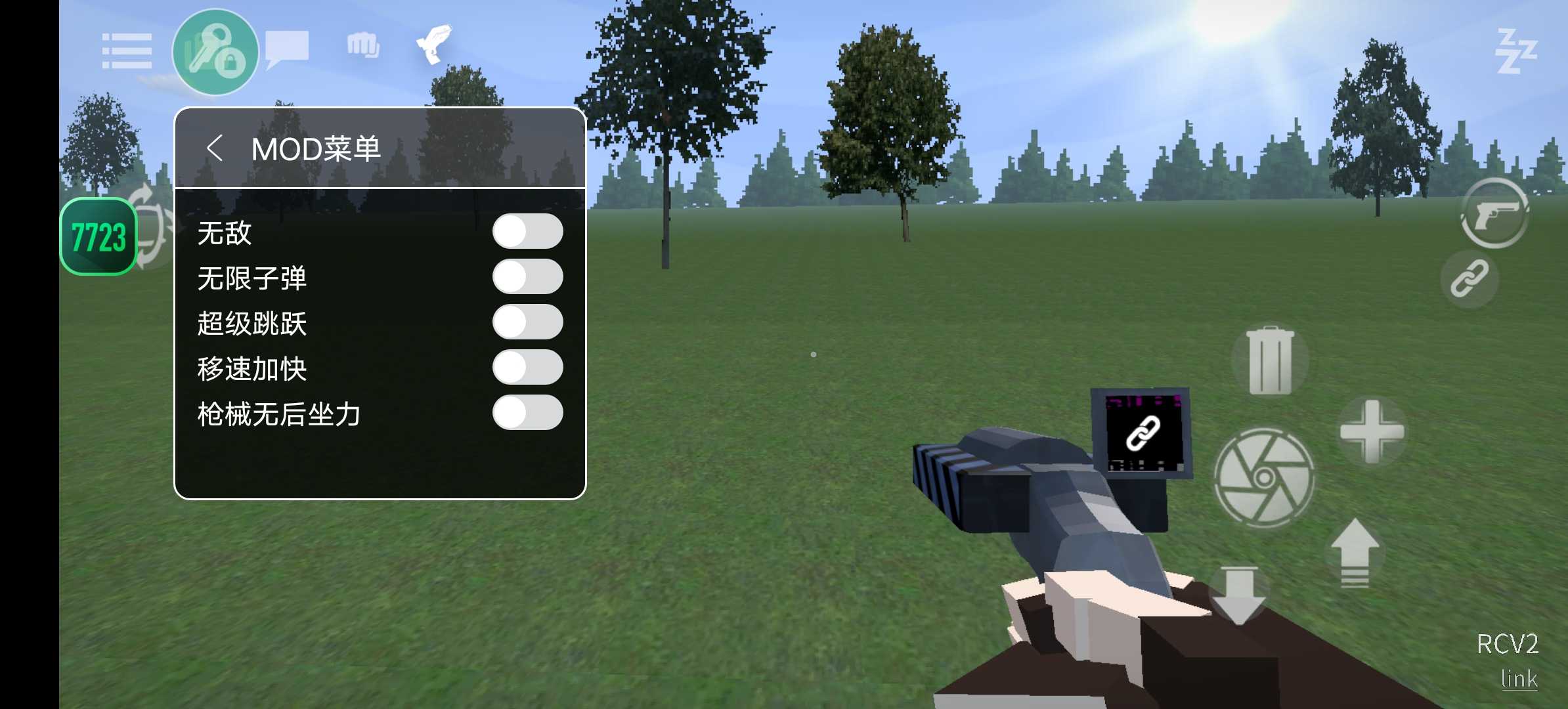点击右边“手枪”按钮拿枪,可以让角色切换到持枪状态,中心用于开枪,+号可以新增靶子角色。