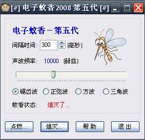 本程序可以发出特殊的声波,对人体无害,但蚊子却难以承受,因为这些声波的频率接近于蚊子天敌(如蜻蜓、蝙蝠)所发出声波的频率,这些特殊的声波将会令蚊子闻声丧胆,逃之夭夭!