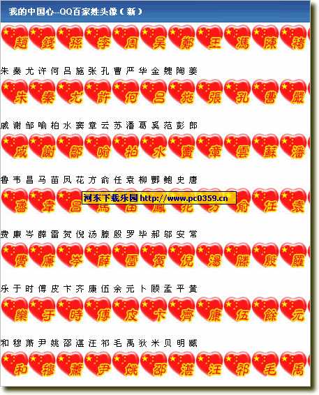 鉴于现在QQ头像中国心版本不断的更新,以及没有一个明确的版本,大家在不停的更换着中国心的头像,现推出了百家姓版的中国心,让自己的姓和中国紧紧的贴在一起,表示我们中国人,不管姓什么都是和我们伟大的祖国站在一起。