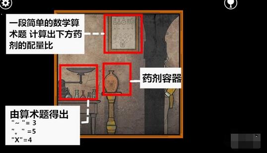 进入关卡来到了第一关,首先点击墙上,发现一道简单的算术题,已知"+"=1、 "·"=2 求"~ "、"。"、"X"为多少。