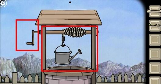 回到场景,有种子必然需要浇水,拾起路边的洒水壶,移动至旁边水井旁,挂上水壶,转动把手,获得纯天然井水一壶。