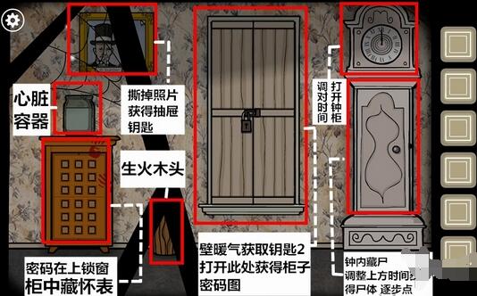 关卡道具:木柴,火柴,斧头,怀表,钥匙1,钥匙2,心脏