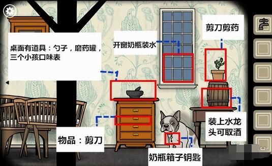 进入关卡首先点击婴儿床可获得道具:水龙头,移至场景右边柜子上获得道具:婴儿口味表,勺子,捣药盆。柜子抽屉里可获得道具:剪 刀。