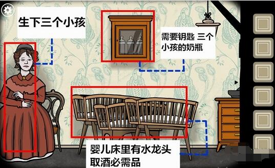 根据婴儿口味表提示,用奶瓶装水,装酒,装奶喂给对应的婴儿,关卡结束。