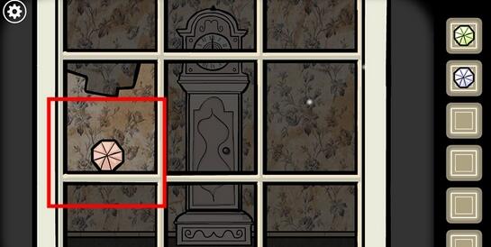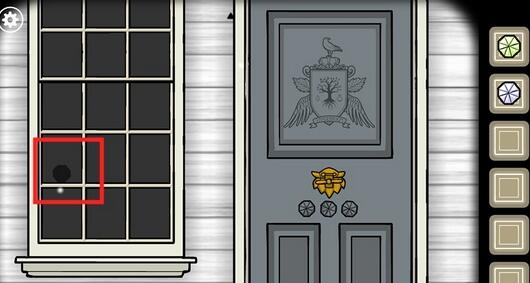 接下来来到场景右侧房屋,有一带三个凹槽的大门,发现门旁玻璃有黑色异物,点击异物处击碎玻璃,获得红色宝石。
