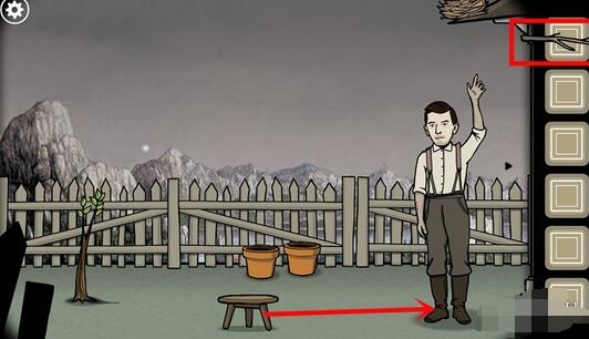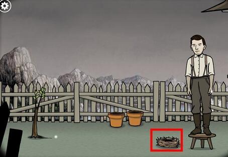 接下来进入第二关卡,观察四周,场景有树,椅子,花盆,鸟窝,房子。首先点击旁边的树,点击枯死的树枝,获得道具。