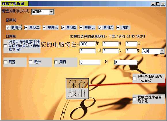 本软件可以实现定时关机/注销/重启动/等功能,另外独具特色的是为用户考虑到了周末关机时间可能与平时有所不同的情况,周末可以单独设定关机时间,这样平时关机时间和周末时间就有所不同..用户可根据需要自己设定