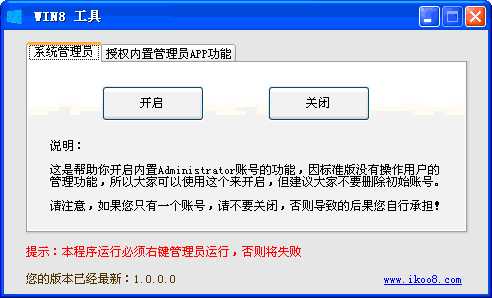 开启内置账号工具是一款win8 下运行的小工具,且仅限于win8系统下,需要.net framework 4.5支持,这个win8下一般自带。主要用于win8标