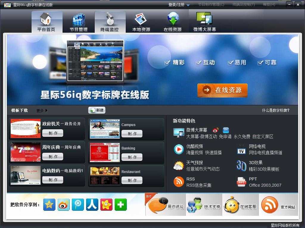 56iq多媒体信息发布系统(或称数字标牌Digital Signage、电子告示)在线版是一款永久免费的数字标牌内容制作软件,用以制作精彩节目在